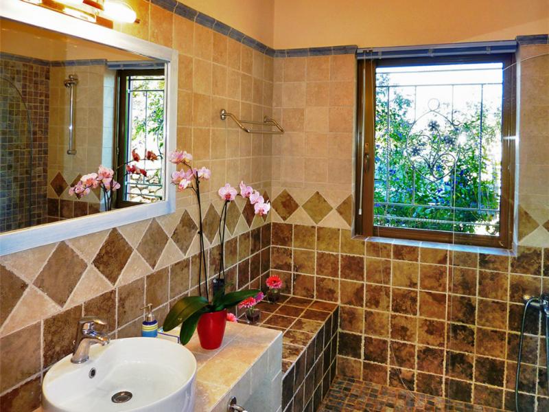 The gorgeous yard is surrounded by stone walls and inlcudes sand-coloured ceramic floor tiles, traditional pebble mosaics and wonderful multi-coloured flowerbeds. The blue waters of the swimming pool dominate, becoming one with the horizon and the sea, constituting one of the most beautiful parts of the villa.
